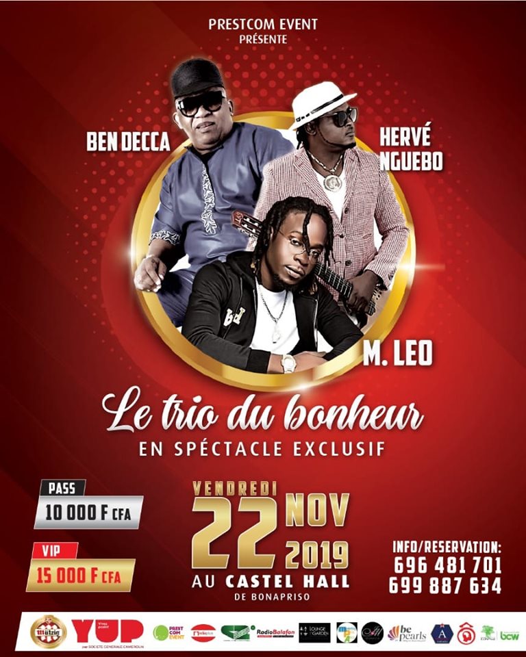 Trois artistes, trois générations pour un but commun « procurer du bonheur ». Pestcom Event présente les artistes BEN DECCA, HERVE NGUEBO et Mr LEO, le trio du bonheur en en spectacle exclusif le vendredi 22 Novembre 2019 dans la somptueuse salle du Castel Hall de Bonapriso.