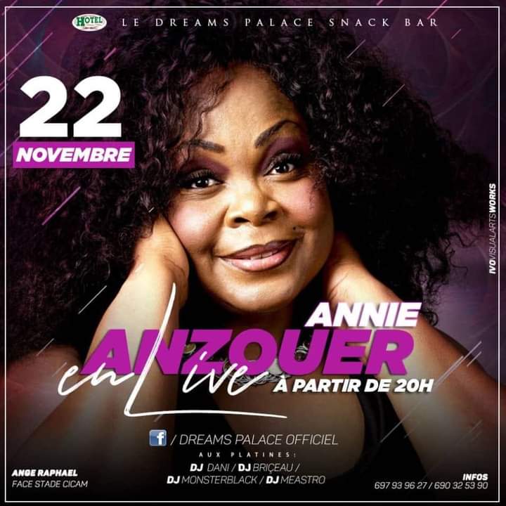 Retrouvez l’artiste camerounaise Annie Anzouer en concert live au Dreams Palace Snack-Bar, sis au stade Cicam Ange Raphaël, Dimanche 22 Novembre 2020.
