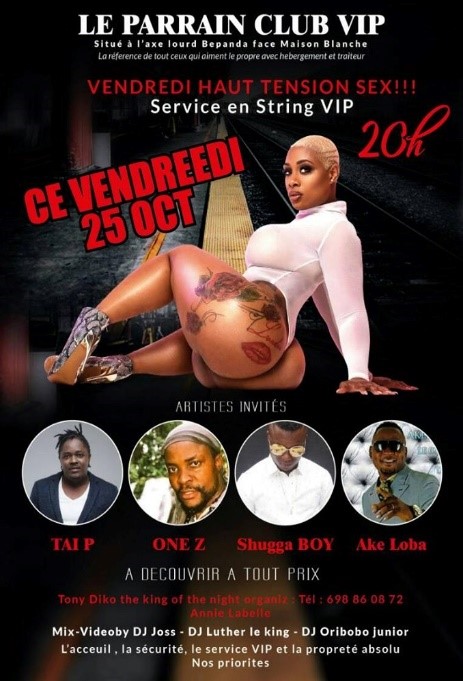| Le PARRAIN CLUB VIP situé à l’axe lourd Bepanda, face Maison Blanche, présente la soirée spéciale « Vendredi Spécial Haute Tension » le vendredi 25 Octobre 2019, avec les artistes TAI P, ONE Z, SHUGGA BOY et AKE LOBE FILS.