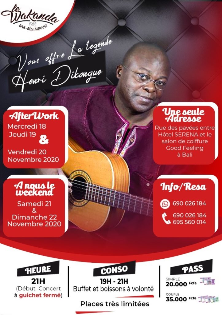 Henri Dikongue en Concert au Restaurant-Bar Le Wakanda les 20, 21 et 22 Novembre 2020