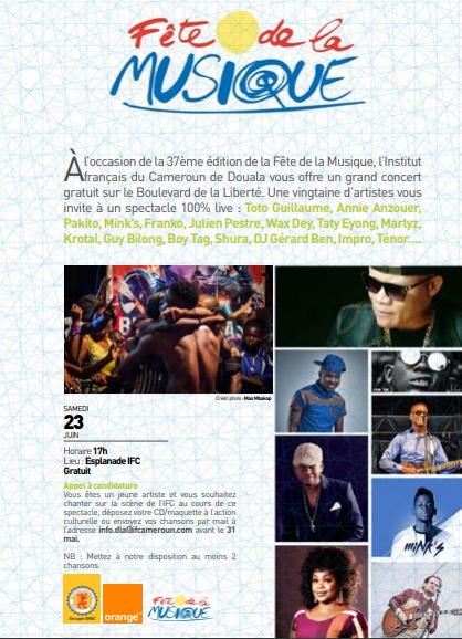 À l’occasion de la 37ème édition de la Fête de la Musique, l’Institut français du Cameroun de Douala vous offre un grand concert gratuit sur le Boulevard de la Liberté. Une vingtaine d’artistes vous invite à un spectacle 100% live : Toto Guillaume, Annie Anzouer, Pakito, Mink’s, Franko, Julien Pestre, Wax Dey, Taty Eyong, Marlyz, […]